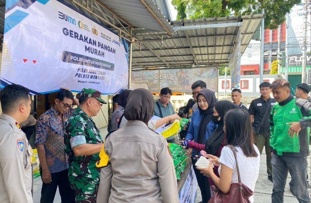 WONOGIRI (Soloaja.co) – Kepolisian Resor (Polres) Wonogiri menggelar kegiatan Gerakan Pangan Murah Polri untuk Masyarakat di halaman Polsek Kota Wonogiri, Jumat (13/3/2026). Langkah ini dilakukan sebagai upaya nyata membantu masyarakat mendapatkan kebutuhan pokok dengan harga terjangkau sekaligus menjaga stabilitas harga pangan di pasaran.