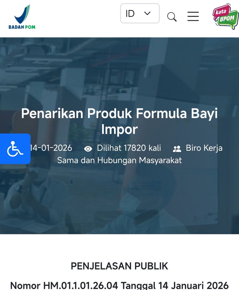 JAKARTA (Soloaja.co) – Badan Pengawas Obat dan Makanan (BPOM) secara resmi memerintahkan penarikan produk formula bayi impor S-26 Promil Gold pHPro 1 (usia 0-6 bulan). Langkah ini diambil menyusul peringatan global terkait potensi cemaran toksin cereulide pada bahan baku minyak ARA yang digunakan dalam produksi di pabrik Nestlé Suisse SA, Swiss.