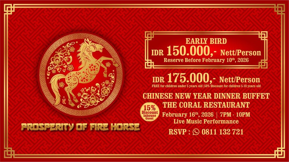 Acara santap malam ini akan digelar pada Senin, 16 Februari 2026, mulai pukul 19.00 hingga 22.00 WIB di The Coral Restaurant. Para tamu akan dimanjakan dengan suasana meriah yang dilengkapi dengan penampilan Live Music sembari menikmati hidangan khas Imlek yang autentik.