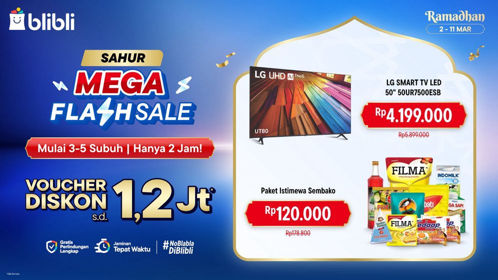 * Sahur Mega Flash Sale (03.00–05.00 WIB): Tersedia paket sembako hingga Smart TV LG 50 inci dengan voucher diskon mencapai Rp1,2 juta.
