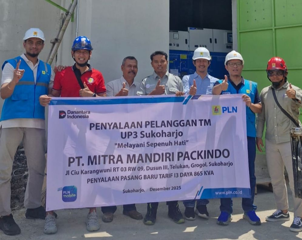 Realisasi pasang baru listrik dengan daya I3/865 kVa diberikan kepada PT Mitra Mandiri Packindo, sebuah perusahaan yang bergerak di bidang Injection Plastic Industry dan berlokasi di Desa Telukan, Kecamatan Grogol, Kabupaten Sukoharjo. Penyalaan ini dilakukan pada Rabu pagi, 24 Desember 2025.