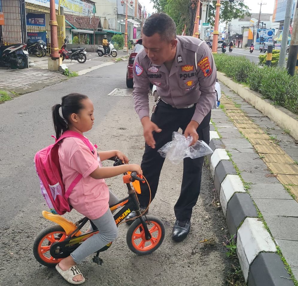 Selain berbagi kebahagiaan, petugas juga memberikan edukasi keselamatan berlalu lintas, termasuk mengingatkan pengendara agar berhati-hati, menghormati pejalan kaki, serta menjaga empati di jalan.
