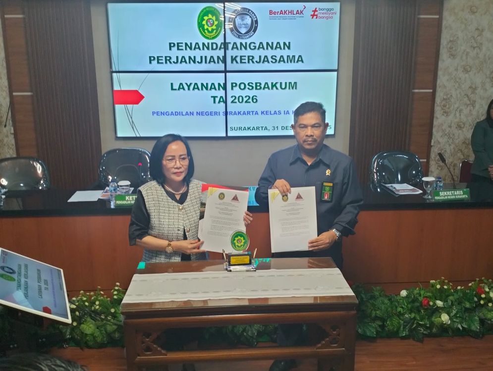 SOLO (Soloaja.co) – Mulai awal tahun 2026, masyarakat kurang mampu di Solo yang terjerat kasus hukum akan mendapatkan bantuan hukum secara gratis. Hal ini menyusul ditandatanganinya nota kesepahaman (MoU) antara Pengadilan Negeri (PN) Solo dengan LBH Solo Justice & Peace pada Rabu (31/12/2025), yang menempatkan LBH tersebut mengisi Pos Bantuan Hukum (Posbakum) di PN Solo.