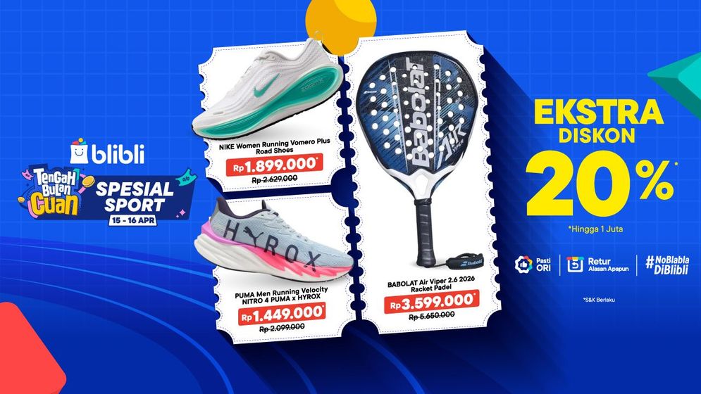 Melalui kampanye ini, pelanggan dapat menikmati Ekstra Diskon 20% hingga Rp1 juta. Tak hanya itu, Blibli juga memanjakan pemburu *gear* olahraga melalui *Exclusive Deals* setiap pukul 12.00 WIB dan *Mega Flash Sale* setiap pukul 18.00 WIB.